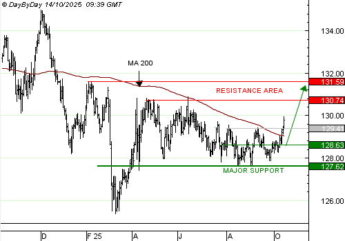 La rupture du support majeur à 127,62 invaliderait cette tendance haussière.