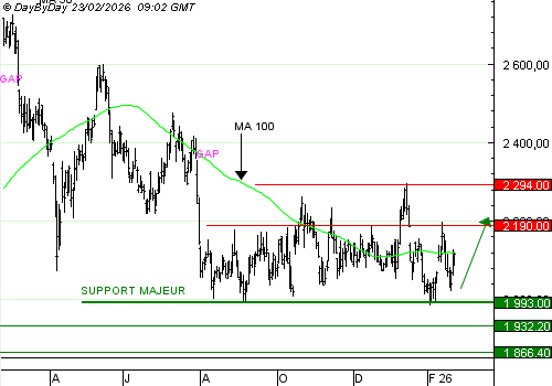 Hermès consolide à plat depuis avril dernier. Le titre n’affiche pas de tendance marquée à court terme, et a corrigé de façon modérée à moyen terme, surtout par rapport à ses concurrents. Le support majeur à 1 993 a été testé à plusieurs reprises, et il a provoqué des rebonds réguliers. Alors que les investisseurs cherchent des alternatives aux investissements dans l’informatique, le secteur du luxe peut reprendre des couleurs, et Hermès rejoindre le haut de son espace de consolidation. Nos objectifs sont modestes : 2 190 euros dans un premier temps, puis 2 294 euros. La rupture du support majeur à 1 993 EUR invaliderait cette anticipation.