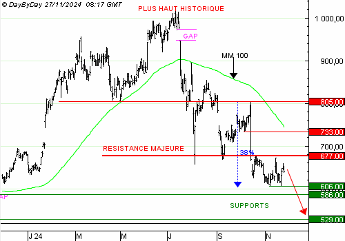 ASML HOLDING NV a déclenché une vive phase baissière après la formation d'un nouveau plus haut historique au-dessus de 1 000 EUR. Les jambes de baisses sont profondes et rapides et les phases de consolidations limitées. Les cours ont récemment effectué un retour de confirmation sur 677 EUR, ancien support devenu résistance majeure. Une nouvelle impulsion baissière est maintenant attendue en direction des soutiens à 606, 586 puis 529 EUR.
