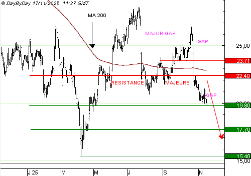 STMicroelectronics a une évolution chaotique en 2025. La large embardée haussière du printemps n’a pas eu de suite à l’automne. Le très large gap baissier ouvert avec les résultats semestriels n’a pas été fermé. Un second gap baissier a suivi les résultats du troisième trimestre, il est toujours ouvert. La tendance est baissière à court terme, et elle est inscrite dans une tendance de moyen terme baissière, accompagnée de sous-performance à l‘égard des indices généraux et technologiques. Avec le gap baissier ouvert vendredi matin, la baisse devrait franchir le récent creux à 19,8 EUR pour rejoindre le plus bas d’avril à 15,4 EUR, avec une pause possible à 17,7 EUR. Le franchissement de la résistance à 22,4 EUR invaliderait le développement baissier à court terme.