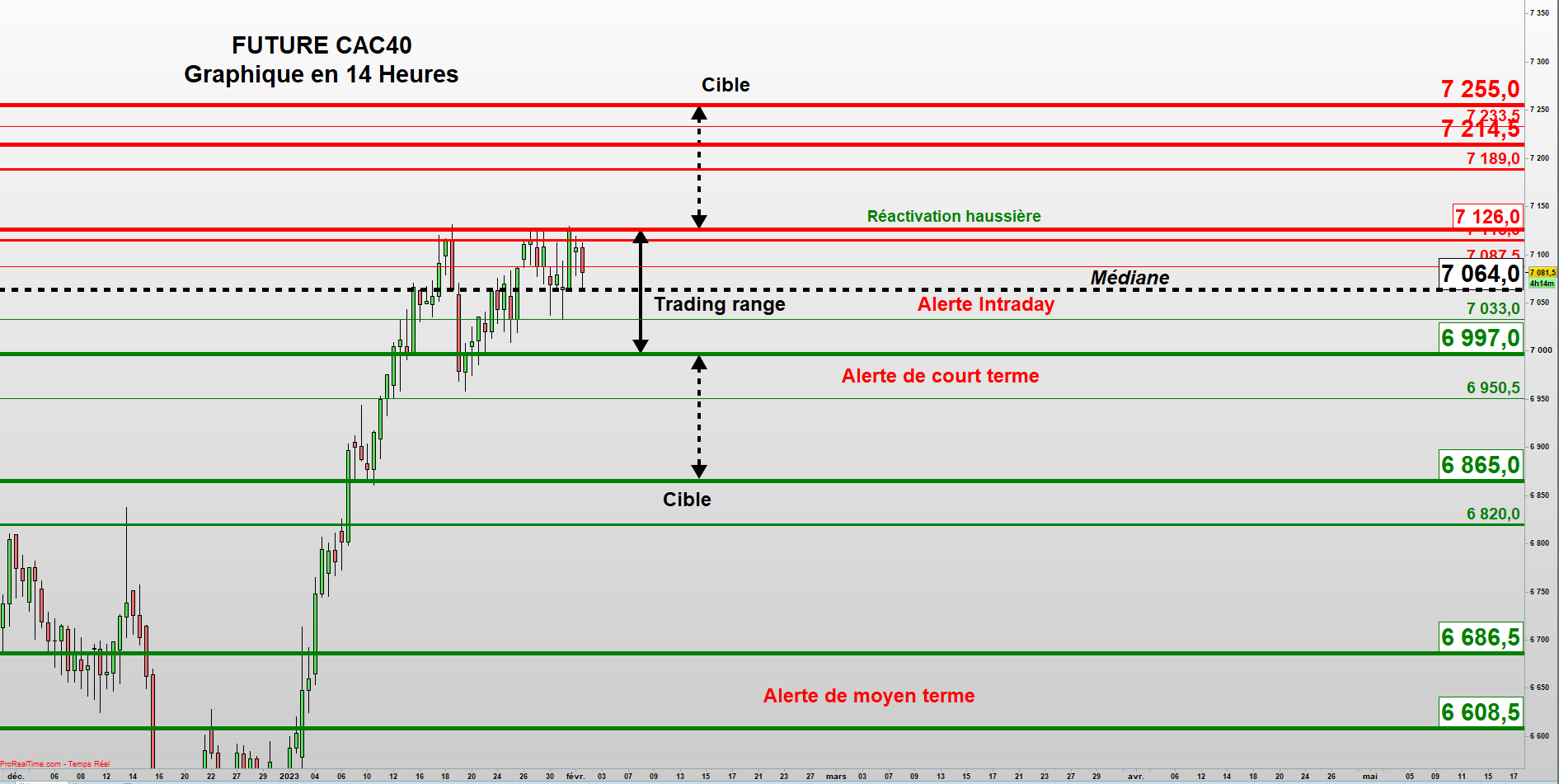Graphiquement, le Future CAC40 (Cf. graphique joint en 14 Heures), poursuit sa consolidation en partie haute, à l’intérieur d’un trading range dont les bornes ont été étendues entre 6997 et 7126. La médiane est positionnée à 7063 et le biais intraday sera positif ou négatif selon que les prix évolueront au-delà ou en deçà de cette médiane.
