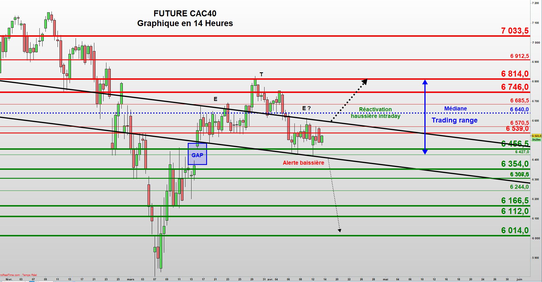 Graphiquement, le Future CAC40 (Cf. graphique joint en 14 Heures), continue son évolution dans la borne basse du trading range, dont les bornes larges sont 6427/6456 et 6746/6814. La médiane à 6640, n’a pas été atteinte depuis le 6 avril.