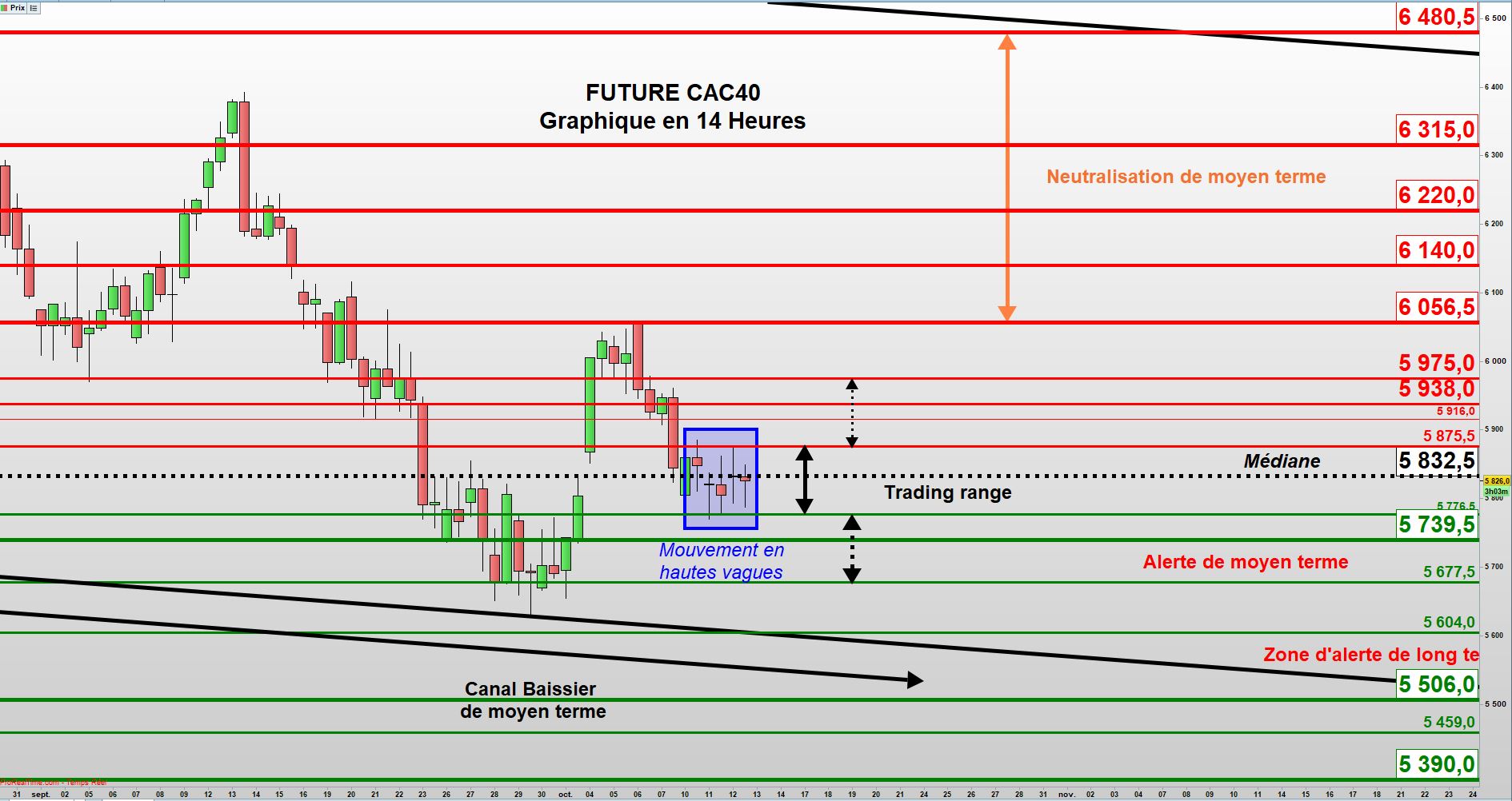 Graphiquement, le Future CAC40 (Cf. graphique joint en 14 Heures), évolue depuis plusieurs jours, dans un petit trading range de court terme, situé entre 5776,5 et 5875,5, dont la médiane est le niveau majeur à 5832,5. La sortie de cette zone de neutralité devrait être rapide et sera déterminante pour les séances à venir.