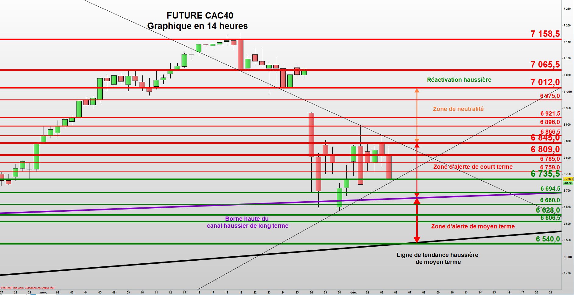 On surveille la formation d’un triangle symétrique, à l’essai à ce stade, car formé uniquement deux points de chaque côté. Ses bornes sont situées entre 6735 et 6850, pour la séance du 6 décembre et rejoignent le trading range actuel mais permettent d’en resserrer la borne basse. 6735 devra donc être préservé.