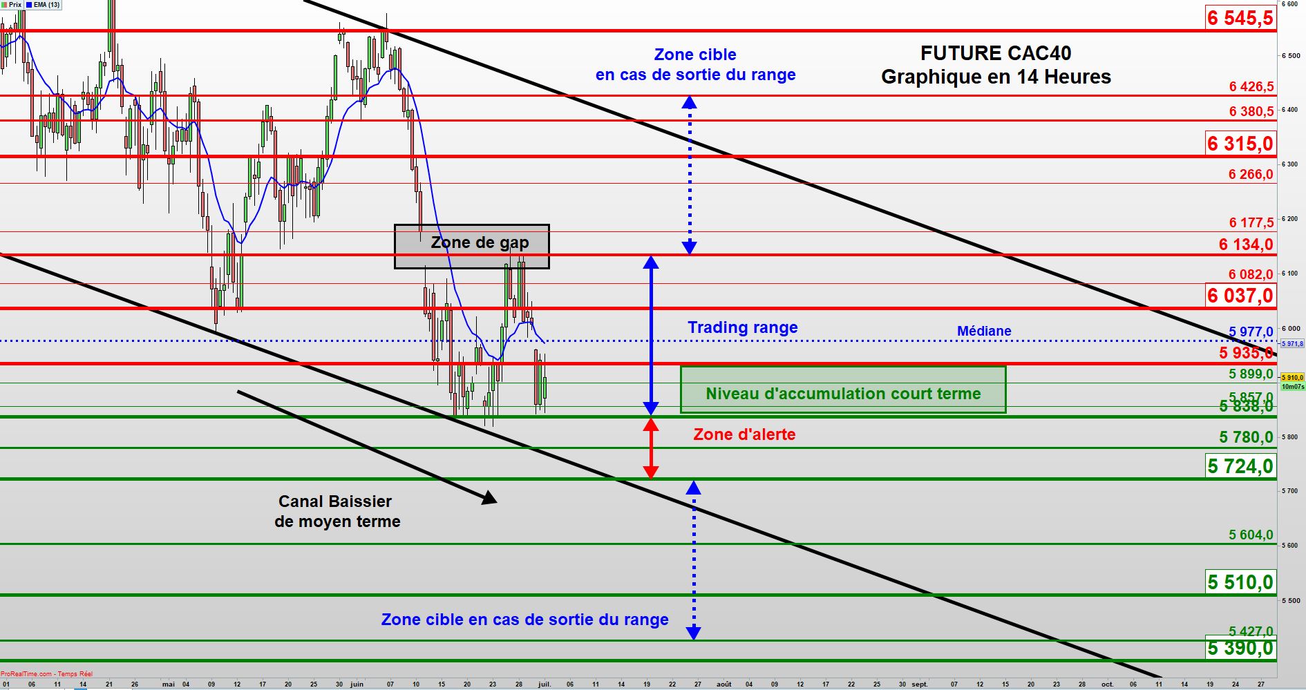 Graphiquement, sur le Future CAC40 (Cf. graphique joint en 14 Heures), a maintenant clairement défini les bornes d’un trading range, qui sont 5838 et 6134 et dont la médiane se situe à 5977. L’évolution en deçà, ou au-delà, de la médiane donnerait un biais, plus directionnel en intraday.