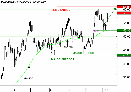 Leonardo a rebondu depuis son gap haussier et sa moyenne mobile à 100 jours. Notre premier objectif est atteint et nous proposons une prise de profit partielle. Le reste de la position peut accompagner le mouvement jusqu'à 61 euros.