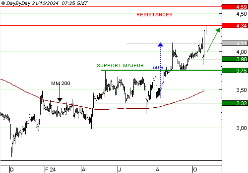 NOKIA OYJ a fortement rebondi sur le support à 3,90 EUR, après la publication de ses résultats. Les cours ont marqué de nouveaux sommets et sont maintenant au contact de la résistance à 4,34 EUR, notre seconde cible. Nous débouclons donc la seconde partie de la position prise sur le Turbo infini Best CALL NOKIA OYJ EB74V.