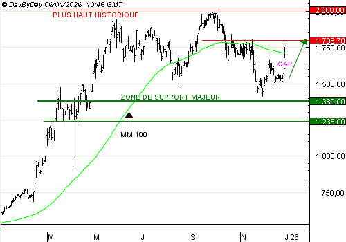 RHEINMETAL bénéficie du regain des tensions géopolitiques provoquées par le président Trump. Après avoir ouvert un large gap haussier, le titre approche d'une résistance intermédiaire à 1796,7 euros. Nous proposons de clôturer cette position.