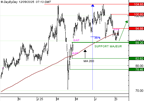 Saint-Gobain a poursuivi son rebond depuis son support majeur. Le gap baissier est fermé. Cette zone peut provoquer une pause dans la reprise et nous proposons de prendre de premiers profits. Une partie de la position peut être conservée pour accompagner le mouvement vers la seconde résistance à 100,6 euros.