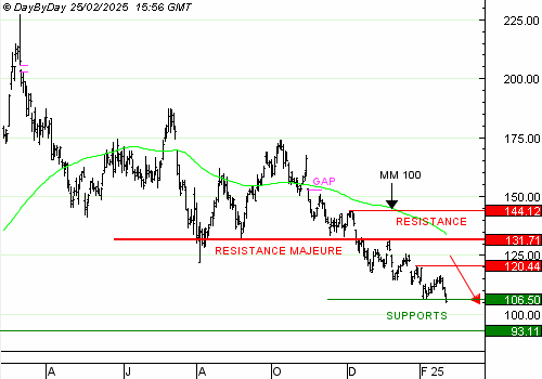 AMD a poursuivi sa chute et rejoint aujourd'hui son précédent creux à 106,5 dollars, notre premier objectif. Ce seuil peut générer une pause avant la reprise de la tendance vers le creux suivant à 93,11 dollars. Nous proposons une prise de profit partielle.