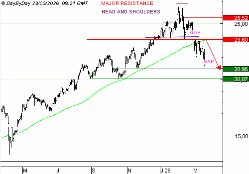 La tête épaules sur ING a bien fait basculer la tendance à la baisse. Le premier support est proche, et nous proposons de prendre une partie des profits. La baisse peut se poursuivre ensuite vers 20,07 euros.