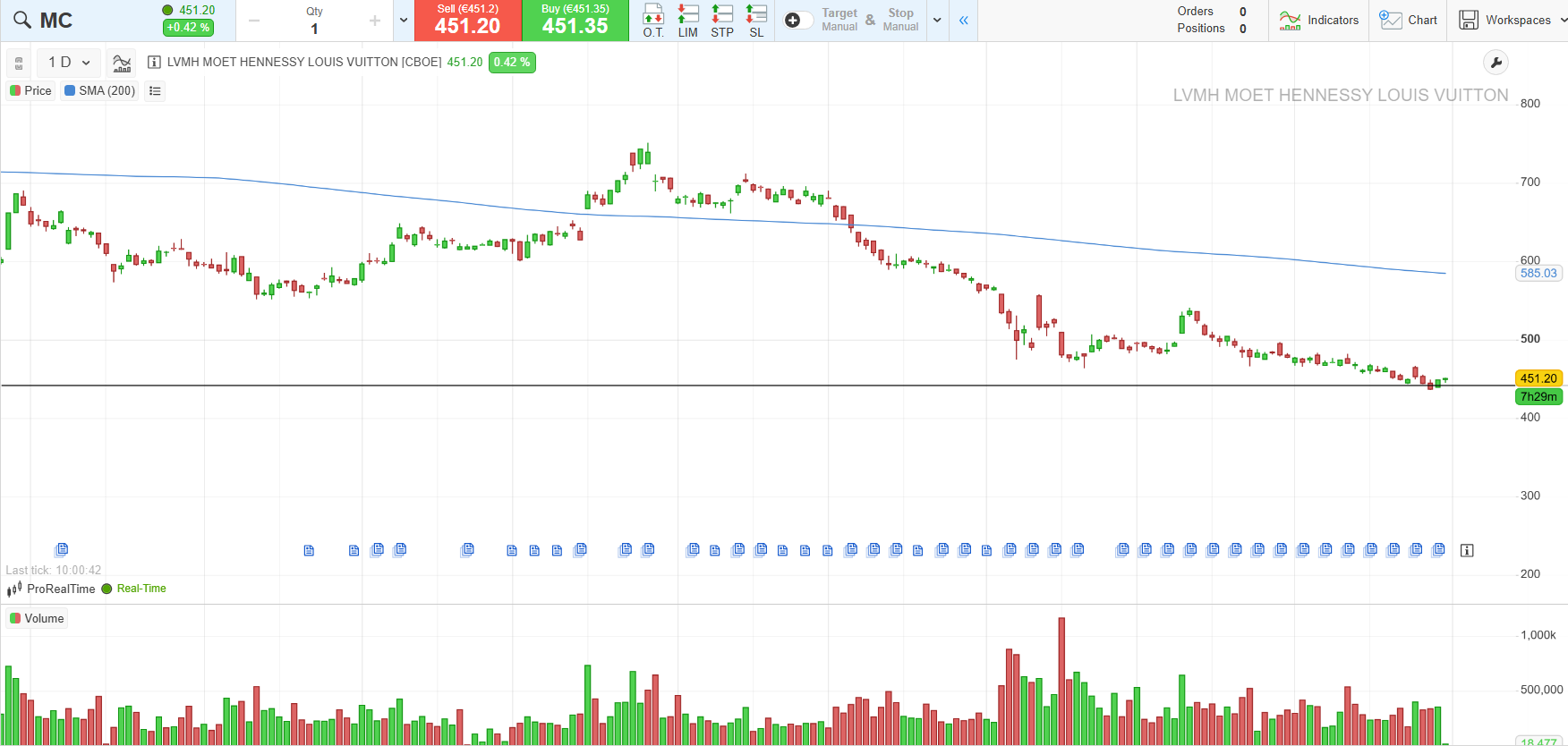 Il semble que le titre LVMH s'eloigne de sa Moyenne mobile 200 jours, nous anticipons un rebond sur la zone support des 450€.