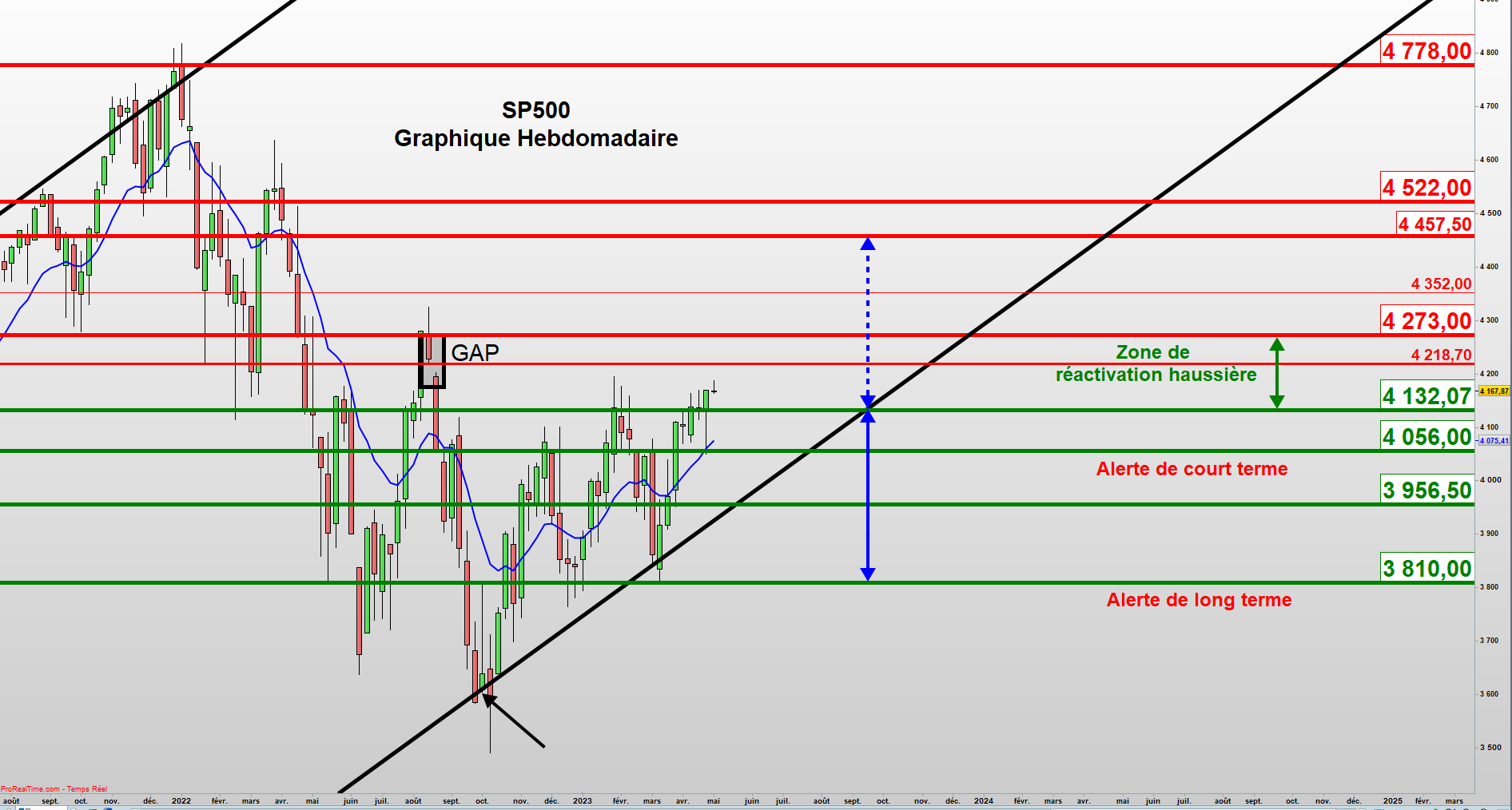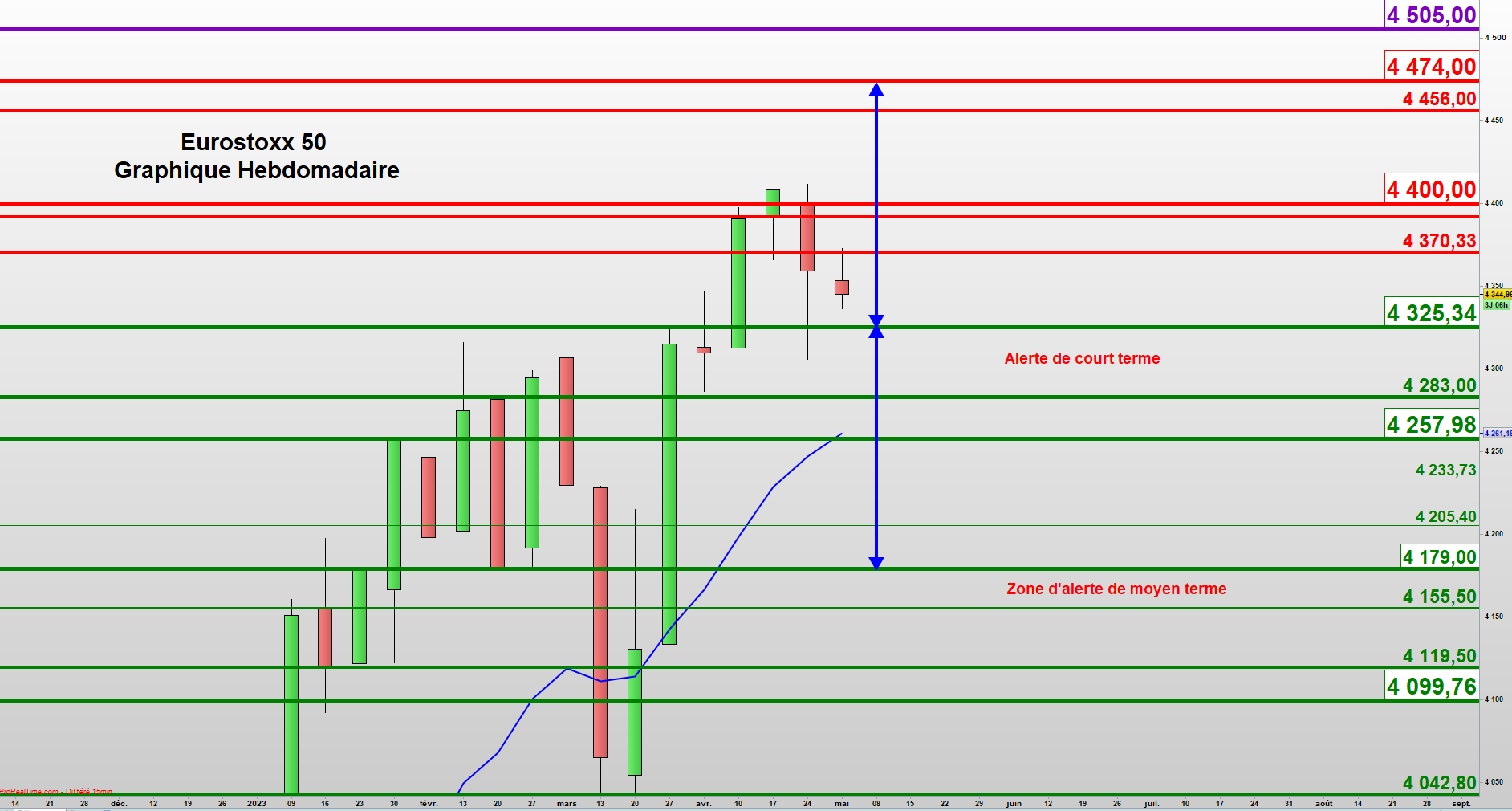 Sa borne basse s’étend de 7333,5 à 7368,5. La rupture de 7333,5 en clôture, marquerait le déclenchement de l’alerte de court terme. L’accélération baissière mènerait alors entre 7158 et 7223.
