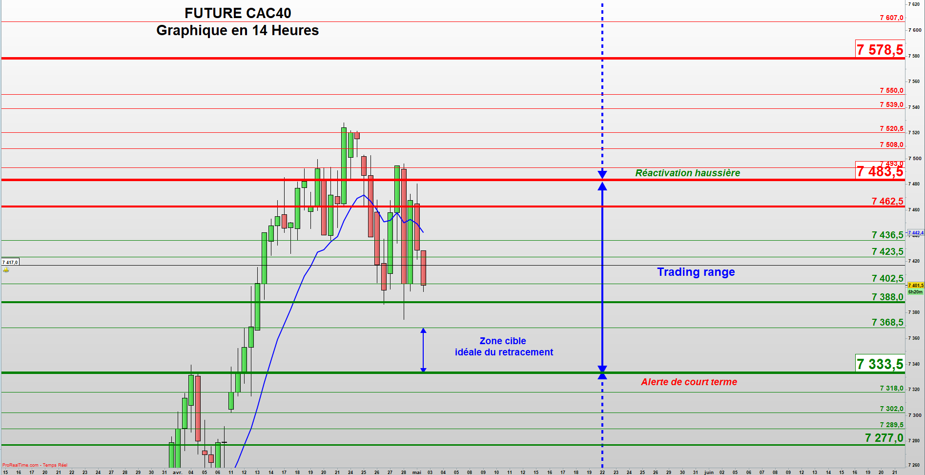 Graphiquement, le Future CAC40 (Cf. graphique joint en 14 Heures), poursuit sa lente et solide consolidation, au sein d’un large trading range.