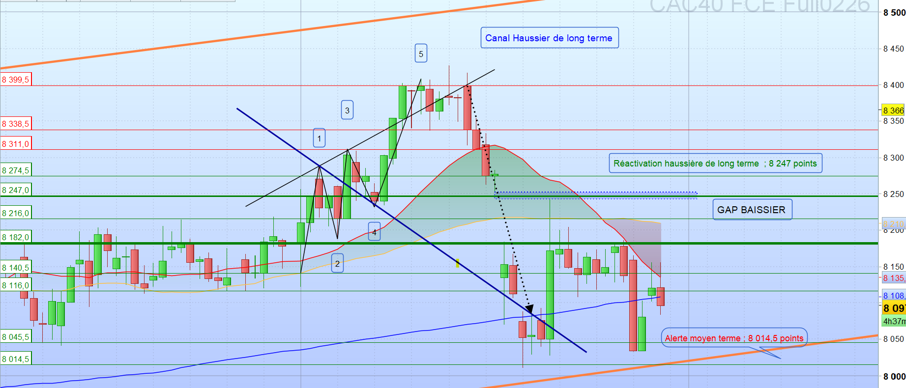 À l’inverse, la configuration de marché reste fragile tant que l’indice évolue à proximité du seuil technique situé autour de 8 014,5 points. Tant que ce niveau est préservé en clôture, l’orientation de fond demeure toutefois haussière. En revanche, une reprise plus affirmée de la dynamique ascendante passerait par le comblement complet du gap baissier ouvert le 20 janvier, compris entre 8 107 et 8 087,5 points. Un retour plus marqué des acheteurs, combiné à un apaisement des tensions géopolitiques, serait alors nécessaire pour permettre un franchissement durable de la résistance majeure des 8 182 points, puis du second gap baissier laissé le 19 janvier entre 8 184,5 et 8 252,5 points. À plus long terme, seule une succession de trois clôtures consécutives au-dessus du seuil des 8 247 points permettrait de réactiver pleinement la tendance haussière de fond.