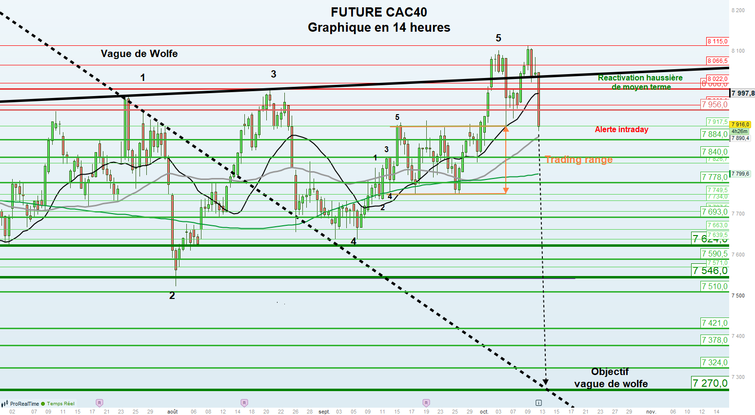 , le Future CAC 40 (cf. graphique en données 14 heures) poursuit sont oscillation autour de l’oblique reliant les points 1 et 3 de la structure de retournement en vague de Wolfe, illustrant sa résilience et sa volonté de tenter l’invalidation de la figure. Tant que ce niveau demeure préservé en clôture, le biais reste orienté à la hausse, avec pour objectif un retour sur les plus hauts historiques situés à 8 236 points. Un franchissement net et confirmé de ce niveau pivot sur un minimum de trois séances, correspondant au sommet inscrit en mai 2024, réactiverait la dynamique haussière de long terme et ouvrirait la voie à une cible située aux alentours de 9 400 points.