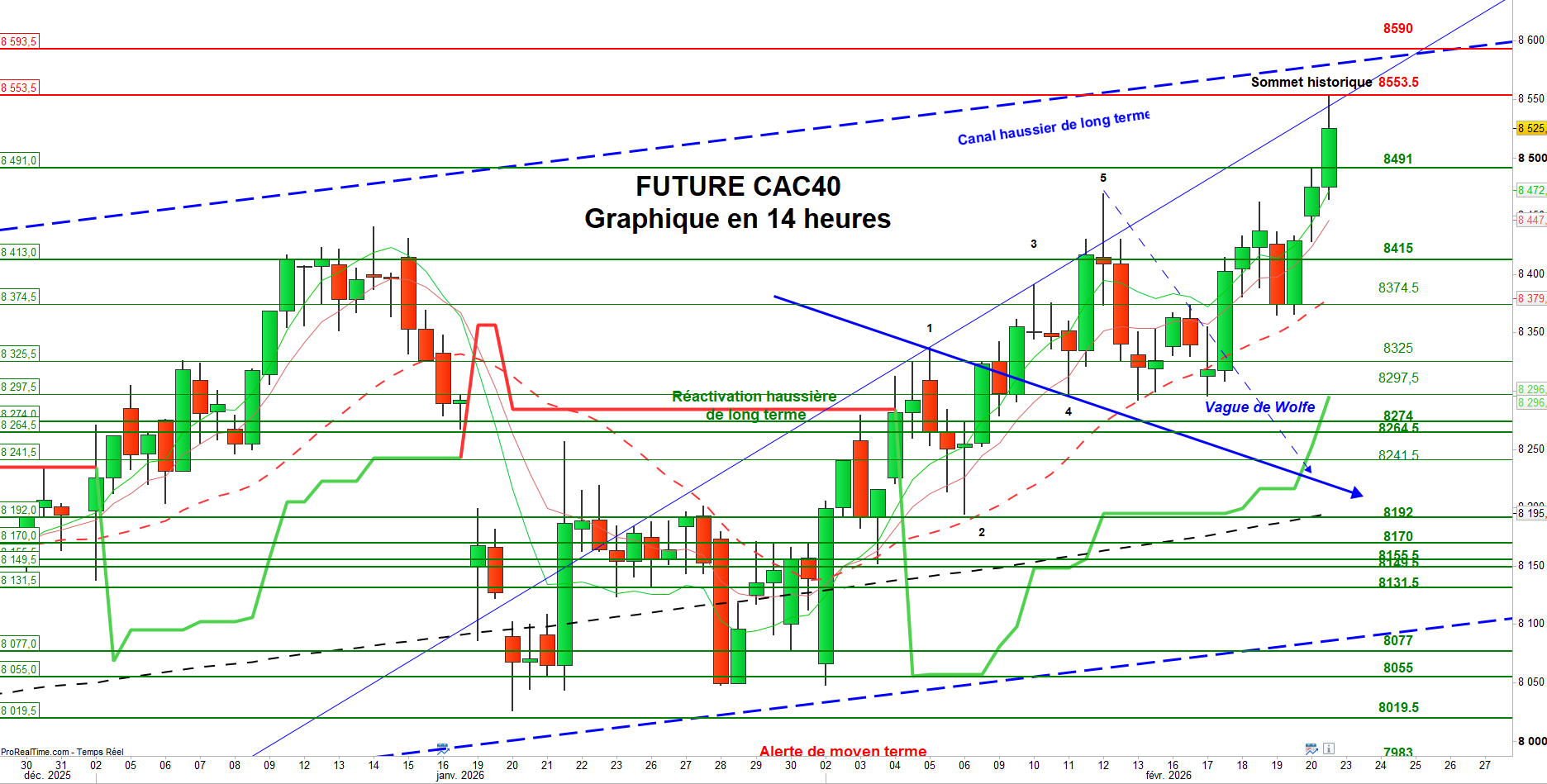 Graphiquement, le future CAC 40 (données à 14h) Le biais haussier s’est nettement renforcé ces dernières séances. Après le double record inscrit le 18 février, suivi d’une courte phase de consolidation les acheteurs ont rapidement repris la main. Cette reprise s’est matérialisée par l’ouverture d’un gap haussier en début de séance, puis par une nouvelle extension de la hausse. L’indice s’est rapproché d’une résistance majeure située autour des 8600 points, correspondant à la borne haute du canal haussier de long terme. Un canal haussier désigne une zone d’évolution encadrée par deux lignes parallèles orientées à la hausse. Il illustre une tendance positive structurée : tant que l’indice évolue à l’intérieur de ce canal, la dynamique reste favorable.