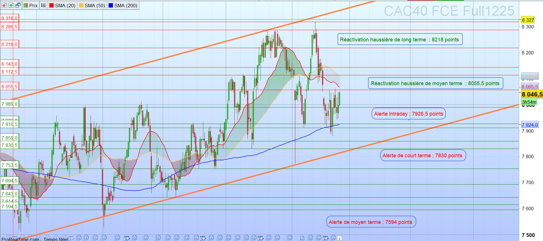 Graphiquement, le Future CAC 40 (données en 14h) évolue toujours au sein de son canal haussier de long terme. L’indice maintient son alerte intraday en restant au-dessus de 7 926,5 points. Une reprise haussière de moyen terme nécessitera un franchissement net et en clôture des 8 055,5 points. Le momentum devra ensuite se renforcer pour dépasser les résistances mineures situées à 8 112,5 / 8 143 et 8 218 points. La prochaine cible technique se situerait alors vers la borne haute du canal, autour de 8 360 points, dont le dépassement durable confirmerait un biais haussier structurel.