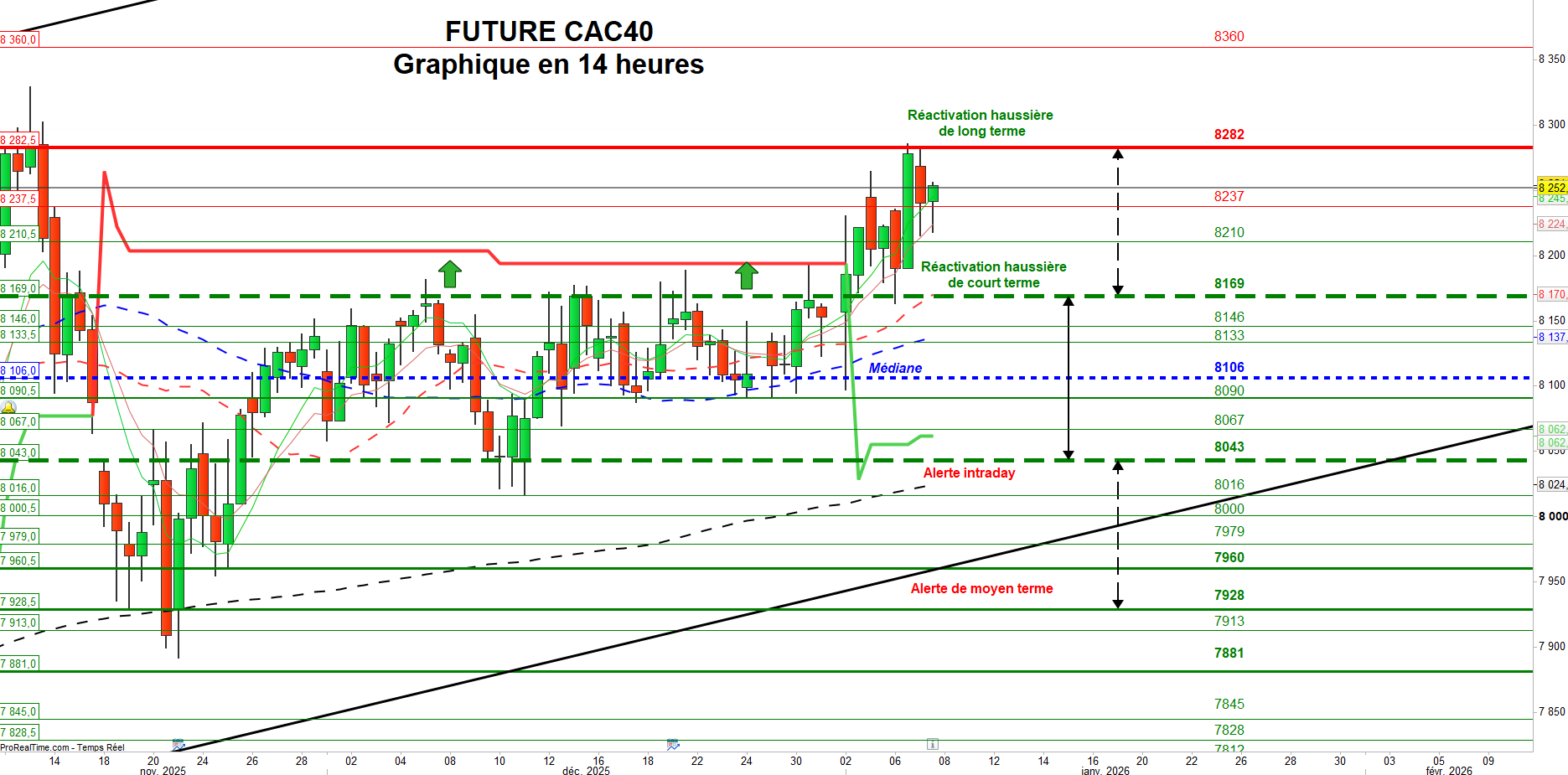 À l’inverse, un retour de l’indice à l’intérieur de la zone comprise entre 8282 et 8169 points viendrait, au mieux, temporiser la dynamique actuelle, avec le risque de la transformer en phase de consolidation en cas de passage durable sous la partie basse. Dans ce scénario, le CAC 40 pourrait alors refluer vers la zone médiane de son ancien trading range, située à 8106 points.