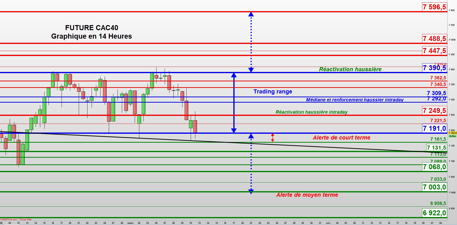 Graphiquement, le Future CAC40 (Cf. graphique joint en 14 Heures), est venu tester la borne basse du large trading range, bien identifié depuis plusieurs jours et située à 7191. Il la préserve en clôture, ainsi que 7161. La zone 7161/7191 reste notre alerte de court terme et sa rupture entrainerait un retour rapide sous le support majeur à 7003.