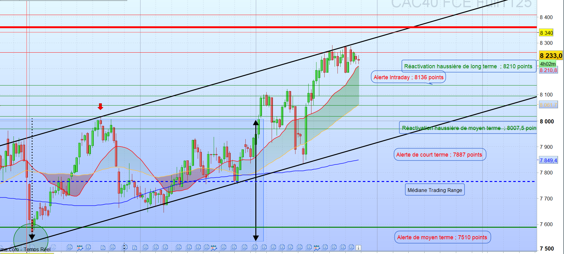 À l’inverse, une clôture du Future CAC 40 sous la borne basse du trading range, accompagnée d’une incursion sous le seuil d’alerte intraday des 8 210 points, raviverait le risque d’une phase corrective. Malgré les tentatives du marché pour consolider son rebond, la prudence demeure de rigueur dans un environnement économique et géopolitique toujours volatil.