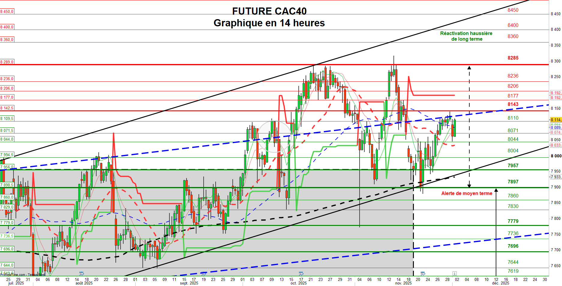 En revanche, un retour sous le point bas du 21 novembre à 7880 points, puis surtout sous les 7830 points, constituerait un véritable signal d’alerte et marquerait probablement un coup d’arrêt plus net de la tendance.