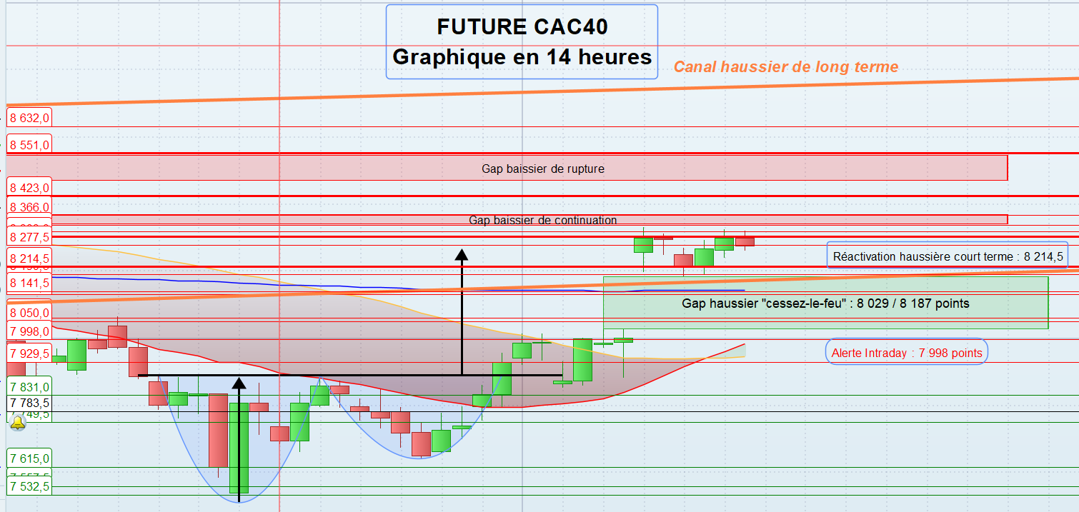 A l’inverse, une sortie du canal haussier, associée au comblement du gap haussier dit de « cessez-le-feu » formé en séance, pourrait être interprétée comme un signe d’essoufflement du marché. Après une ouverture soutenue par un courant acheteur marqué, un repli vers des niveaux plus bas, autour de 8 029 points, s’apparenterait à un simple mouvement de consolidation. En revanche, l’incapacité de l’indice à repartir à la hausse depuis cette zone constituerait un premier signal de fragilité à court terme. Un tel scénario remettrait en question la poursuite de la dynamique positive et traduirait un retour progressif de la pression vendeuse. La configuration se dégraderait nettement en cas de comblement complet du gap, suivi de sa rupture, ce qui pourrait alors ramener l’indice vers un premier seuil d’alerte intraday situé à 7 998 points. Une telle évolution ouvrirait la voie à une phase de correction plus prononcée, avec un risque d’accélération baissière en direction de la ligne de cou de la figure en « tasse avec anse », positionnée à 7 892 points. En cas de rupture de ce niveau clé, le mouvement correctif pourrait s’intensifier, avec des objectifs situés sur les prochains supports identifiés à 7 557,5 puis 7 398,5 points.