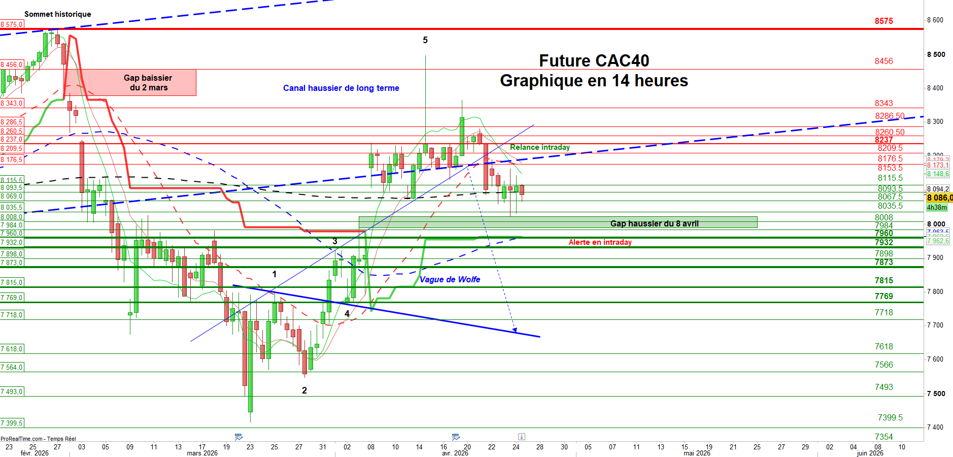 Graphiquement, le future CAC 40 (données à 14h), confirme le retour d’une pression baissière à court terme, amorcée depuis la validation d’une figure de retournement le 21 avril. Cette configuration, de type vague de Wolfe — fait ressortir un objectif situé dans la zone des 7 680 à 7 640 points.
