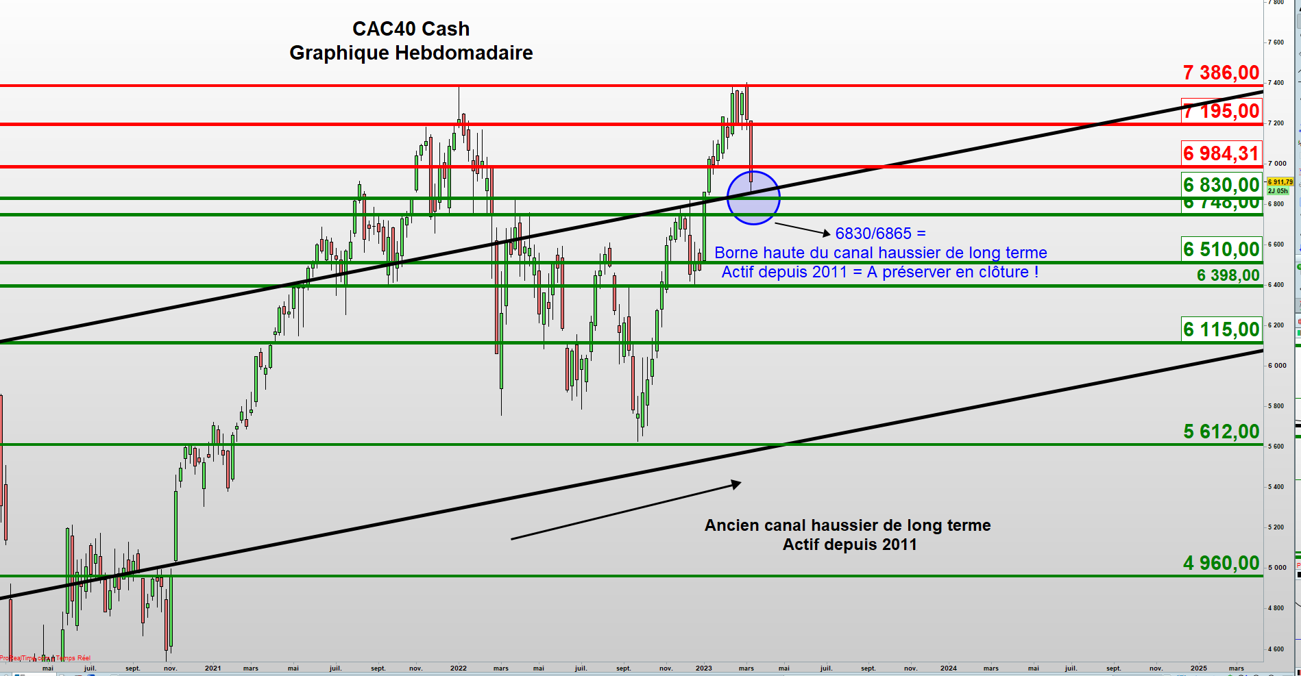 La rupture de la borne basse du range, située 6800,5 déclencherait une impulsion baissière complémentaire avec pour cible 6608,5. C’est notre niveau d’alerte de moyen terme. Il correspond à la borne haute du canal haussier de long terme sur l’indice CAC40 et la zone 6835/6860 (Cf. Graphique hebdomadaire de l’indice CAC40 cash), actif depuis fin 2011 et que l’indice avait débordé début 2023. Ce niveau peut être testé sur 2 ou 3 clôtures et, jusqu’au début de la nouvelle échéance des marchés dérivés d’Avril, lundi 20 mars. Il conviendra cependant, de ne pas s’installer au-dessous, au risque de remettre en question la construction haussière du début d’année. De même, les indices américains testent des niveaux d’alerte majeurs, dont la rupture réactiverait la tendance baissière de moyen et long terme.