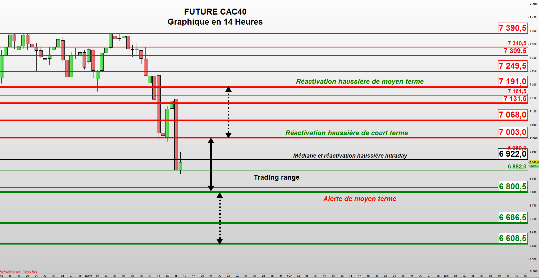 Graphiquement, le Future CAC40 (Cf. graphique joint en 14 Heures), s’établit donc un cran plus bas en rompant le support majeur à 7003. Le nouveau trading range devient 6800.5 / 7003. La médiane de cette nouvelle zone est 6922. Comme toujours, le biais intraday sera plus haussier ou baissier, selon qu’on s’établira au-dessus ou en-dessous.