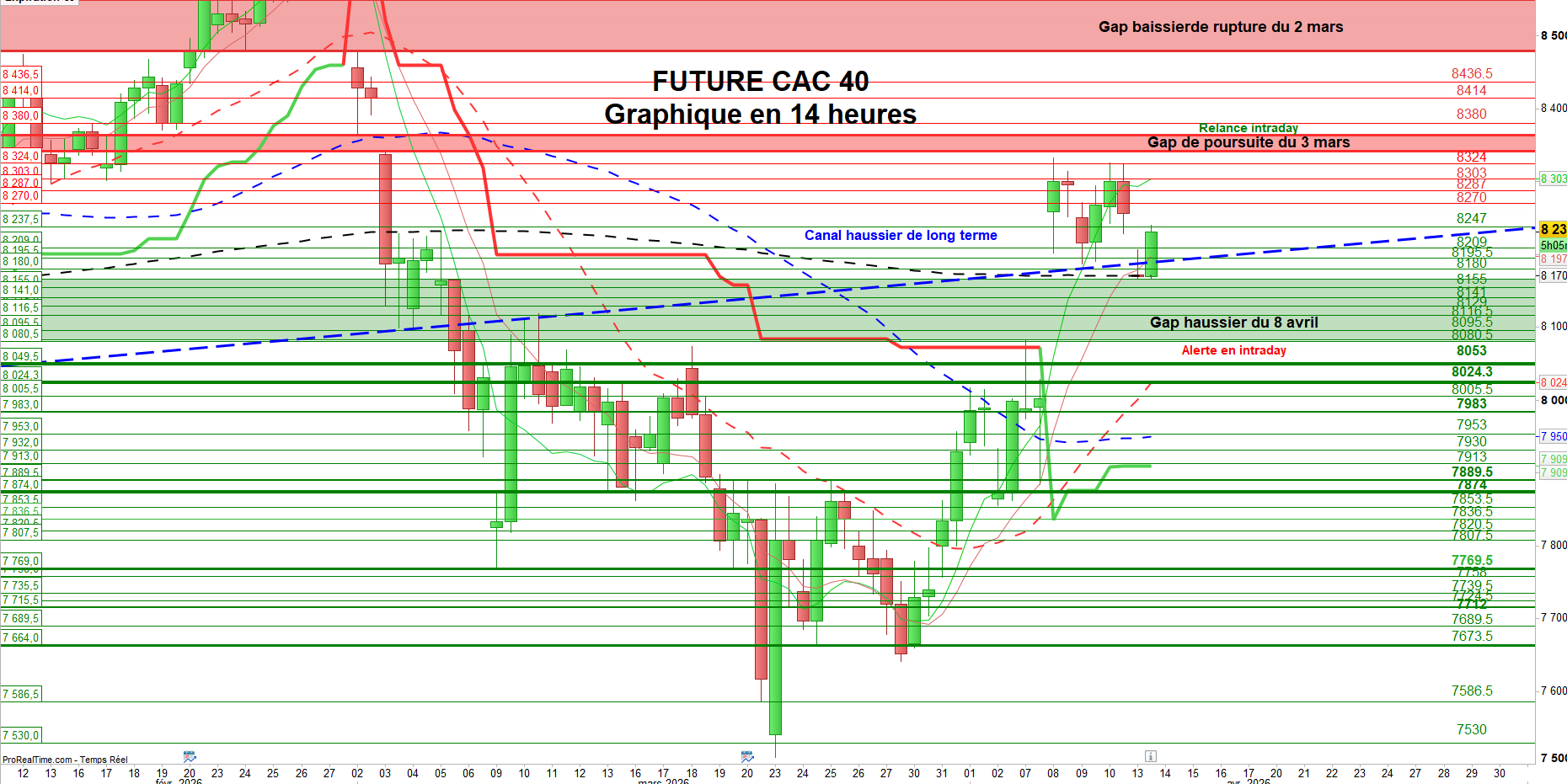 Graphiquement, le future CAC 40 (données à 14h) affiche un regain de faiblesse, après les signes d’amélioration observés la semaine dernière, qui avaient permis de combler partiellement le gap baissier de poursuite du 3 mars.