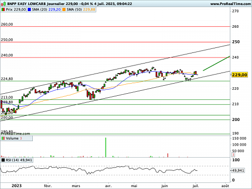 Au regard des éléments graphiques mentionnés, l'équipe de BFM Bourse propose aux investisseurs actifs de prendre position à l'achat sur le tracker EASYETF LOWCARBON, au cours actuel, avec les 270.0000 € dans le viseur. Un stop de protection devra être placé à 215.0000 €.