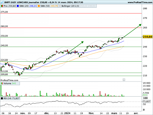 Au regard des éléments graphiques mentionnés, l'équipe de BFM Bourse propose aux investisseurs actifs de prendre position à l'achat sur le tracker EASYETF LOWCARBON, au cours actuel, avec les 275.0000 € dans le viseur. Un stop de protection devra être placé à 239.0000 €.
