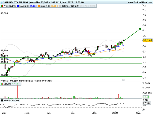 Le tracker (ETF) sélectionné reproduit, sans effet de levier, les variations de l'indice STOXX Europe 600 Banks Net Return EUR, qui regroupe les plus grandes capitalisations du secteur bancaire en Europe (Royaume-Uni inclus). Un produit d'indexation en pleine tendance haussière dans le contexte d'une tension sur le marché obligataire, qui a un impact direct sur la rentabilité des activités bancaires. Les 5 premières capitalisations du panier sont HSBC, BNP-Paribas, Banco Santander, ING Groep, et Nordea Bank.