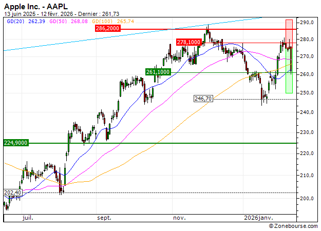 (Zonebourse.com) Le titre Apple Inc. présente une configuration positive sur le court terme au-dessus du support des 261.05 USD. La zone de résistance des 278.12 pourrait toutefois…