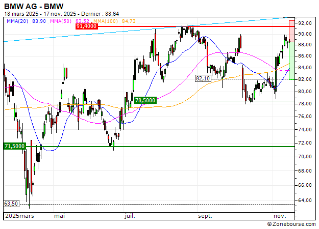 Après le rebond de ces dernières séances, le titre BMW AG revient au contact de la zone de résistance des 91.42 EUR. Cette zone de cours pourrait susciter de nouveaux dégagements et renvoyer le titre sur les 82 EUR, première zone de soutien importante.