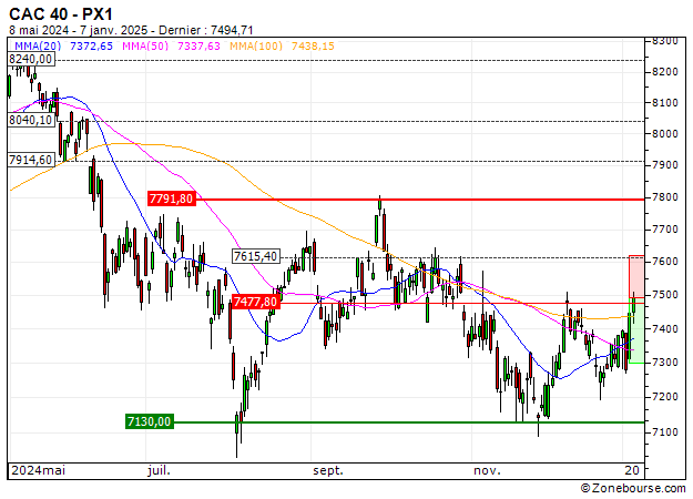 La reprise technique dernièrement observée sur le CAC 40 devrait trouver un point d'arrêt dans la zone de cours actuelle. Le timing apparaît pertinent pour anticiper le retour d'une dynamique baissière, avec les 7300 points comme principal objectif.