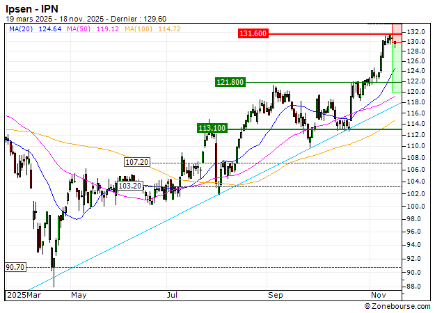 Le titre Ipsen a fortement rebondi ces dernières séances, revenant à proximité des 131.6 EUR. La proximité de la résistance moyen terme laisse envisager une consolidation en direction des 120 EUR, scénario conforté par les récentes révisions baissières des perspectives de bna.