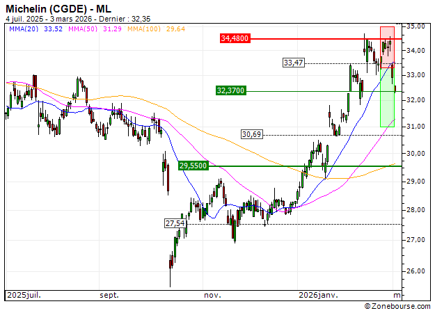 Michelin (CGDE) : Vente du turbo PUT Société Générale 8R73S (+19.23%) (8R73S)