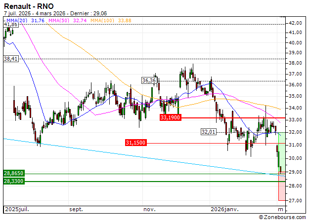 Le récent mouvement baissier a renvoyé le titre Renault au contact de niveaux intéressants situés vers 28.8 EUR. Cette zone pourrait faire barrage au trend baissier de ces dernières séances et confère un bon timing à l'ouverture de positions acheteuses.