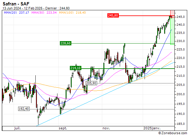 Le titre est en situation de surachat, à proximité d'une résistance court terme située à 245.8 EUR. Le timing est adéquat pour se placer vendeur sur Safran en anticipant des prises de bénéfices en direction des 228 EUR.